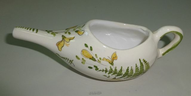 Biberon de malade en faïence avec un décor peint à la main ayant un long bec muni d'une anse disposée à l'arrière par rapport au bec.Inscription : Faïence. Diamètre : 6.5 cm. Longueur : 16 cm.