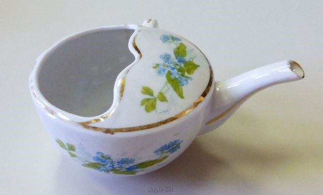 Biberon de malade, décor fleuri sur le pourtour et sur le dessus, avec un filet d'or. Anse disposée perpendiculairement par rapport au bec. Sans inscription. Diamètre : 8.5 cm.
