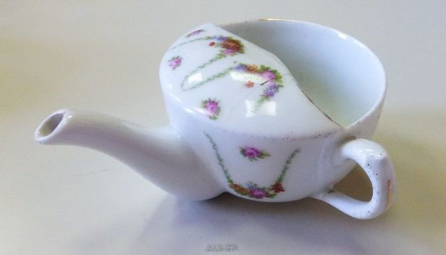 Biberon de malade, décor fleuri sur le pourtour et sur le dessus, avec un filet d'or à moitié effacé. Présence de 7 petits trous devant le bec verseur. Anse disposée perpendiculairement par rapport au bec. Inscription : 7120. Diamètre : 10 cm.