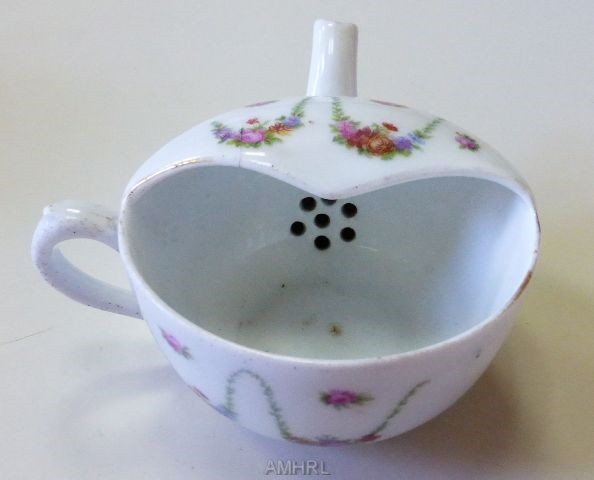Biberon de malade, décor fleuri sur le pourtour et sur le dessus, avec un filet d'or à moitié effacé. Présence de 7 petits trous devant le bec verseur. Anse disposée perpendiculairement par rapport au bec.Inscription : 7120. Diamètre : 10 cm.