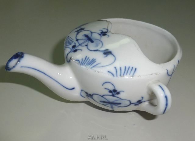 Biberon de malade, décor bleu sur le pourtour et sur le dessus. Anse disposée perpendiculairement par rapport au bec. Sans inscription. Diamètre : 8.5 cm.