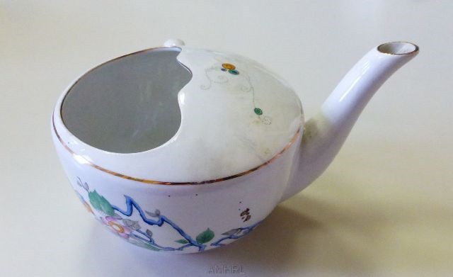 Biberon de malade, décor fleuri sur le pourtour et sur le dessus, avec un filet d'or. Anse disposée perpendiculairement par rapport au bec.
