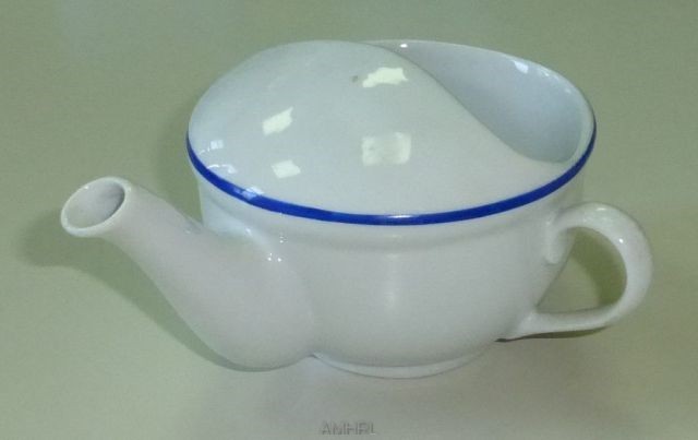 Biberon de malade, décor constitué d'un liseré bleu. Anse disposée perpendiculairement par rapport au bec.Inscription : H & Cie. Heinrich, Selb Bavaria, Germany. Diamètre : 10 cm.