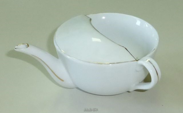Biberon de malade en porcelaine blanche avec un décor constitué d'un filet doré. Anse disposée perpendiculairement par rapport au bec. Pas d'inscription. Diamètre : 10.5 cm.