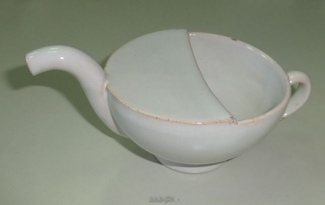 Biberon de malade en porcelaine blanche avec un décor constitué d'un filet orangé. Anse disposée à l'arrière par rapport au bec. Diamètre : 10 cm. Longueur : 16 cm.