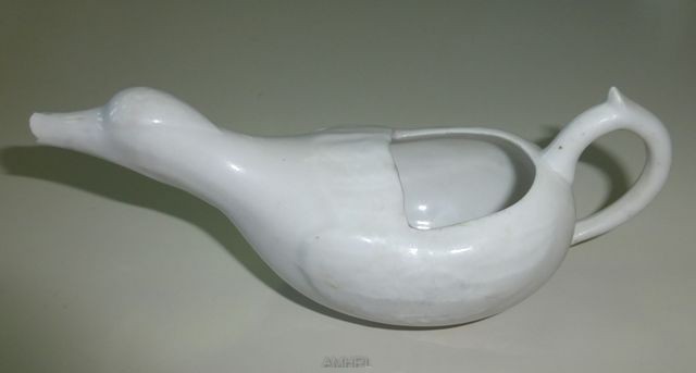 Biberon de malade en porcelaine blanche ayant la forme d'un canard muni d'une anse disposée à l'arrière par rapport au bec. Diamètre : 6.5 cm. Longueur : 17 cm.