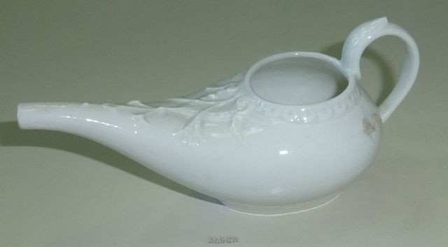Biberon de malade en porcelaine blanche ayant un long bec muni d'une anse disposée à l'arrière par rapport au bec. Décor sculpté de feuilles sur le dessus. Diamètre : 7 cm. Longueur : 16.5 cm.