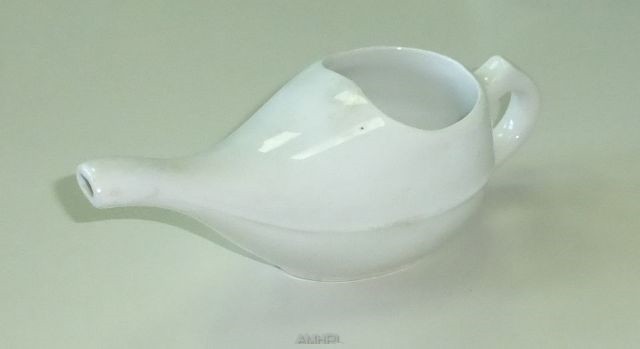 Biberon de malade en porcelaine blanche ayant un long bec muni d'une anse disposée à l'arrière par rapport au bec. Décor sculpté d'un petit rebord sur le dessus. Diamètre : 7 cm. Longueur : 18 cm.