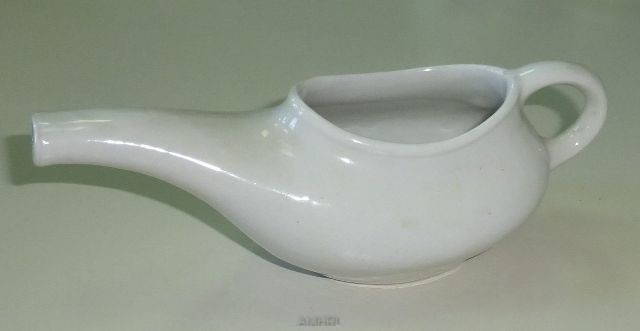 Biberon de malade en porcelaine blanche ayant un long bec muni d'une anse disposée à l'arrière par rapport au bec.Diamètre : 6.5 cm. Longueur : 17 cm.