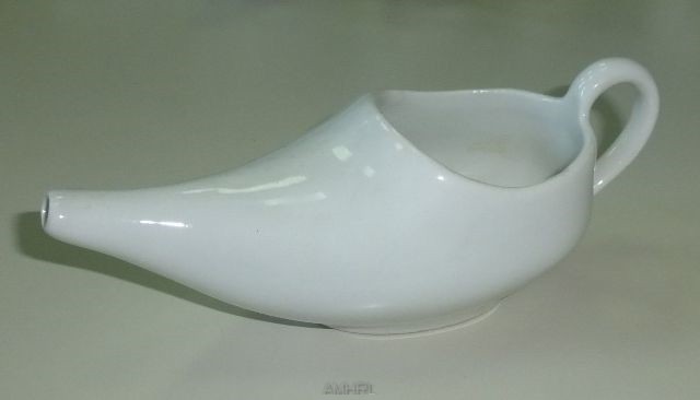 Biberon de malade en porcelaine blanche ayant un long bec muni d'une anse disposée à l'arrière par rapport au bec. Diamètre : 7 cm. Longueur : 17 cm.