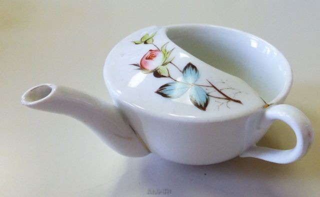 Biberon de malade, décor fleuri sur le pourtour et sur le dessus, avec un filet d'or à moitié effacé.Anse disposée perpendiculairement par rapport au bec. Sans inscription. Diamètre : 10 cm.