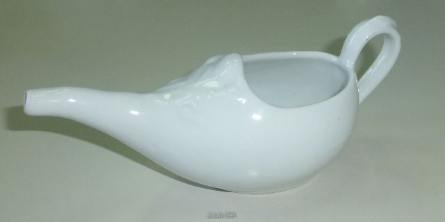 Biberon de malade en porcelaine blanche avec un motif de feuillage ayant un long bec muni d'une anse disposée à l'arrière par rapport au bec.Diamètre : 7 cm. Longueur : 17.5 cm.
