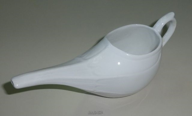 Biberon de malade en porcelaine blanche avec des rainures sur le dessus ayant un long bec muni d'une anse disposée à l'arrière par rapport au bec. Diamètre : 6 cm. Longueur : 19 cm.