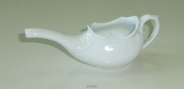 Biberon de malade en porcelaine blanche ciselée sur le dessus ayant un long bec muni d'une anse disposée à l'arrière par rapport au bec.Diamètre : 6 cm. Longueur : 15 cm.
