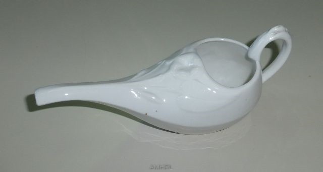 Biberon de malade en porcelaine blanche avec des motifs de feuillages et de fleurs sur le dessus ayant un long bec muni d'une anse disposée à l'arrière par rapport au bec. XIXe siècle. Diamètre : 6 cm. Longueur : 17 cm.