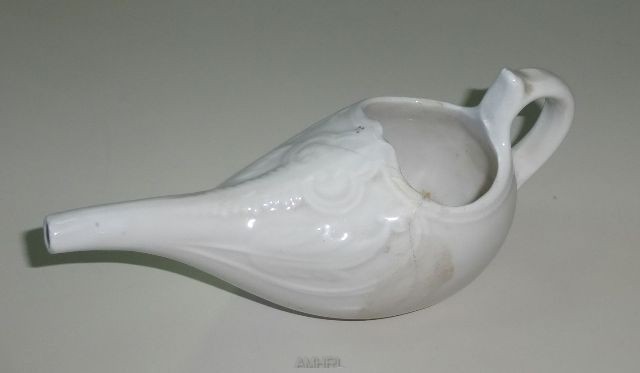Biberon de malade en porcelaine blanche avec des motifs de feuillages sur le dessus ayant un long bec muni d'une anse disposée à l'arrière par rapport au bec. Diamètre : 7 cm. Longueur : 18 cm.