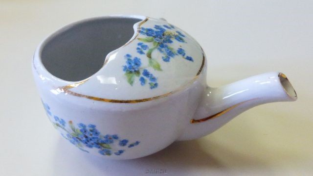 Biberon de malade, décor fleuri sur le pourtour et sur le dessus, avec un filet d'or. Anse disposée perpendiculairement par rapport au bec. Inscription : 98. Diamètre : 9 cm.