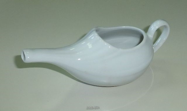 Biberon de malade en porcelaine blanche avec des rainures sur le dessus et sur les cotés ayant un long bec muni d'une anse disposée à l'arrière par rapport au bec.Diamètre : 6 cm. Longueur : 15 cm.