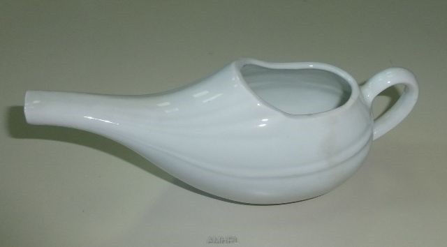 Biberon de malade en porcelaine blanche avec des rainures sur le dessus et sur les cotés ayant un long bec muni d'une anse disposée à l'arrière par rapport au bec. Diamètre : 6,5 cm. Longueur : 16,5 cm.