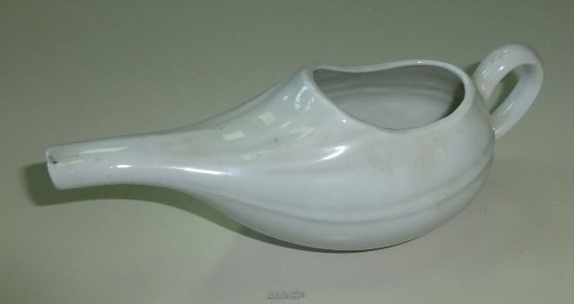 Biberon de malade en porcelaine blanche avec des rainures sur le dessus et sur les cotés ayant un long bec muni d'une anse disposée à l'arrière par rapport au bec.Diamètre : 7.5 cm. Longueur : 19 cm.
