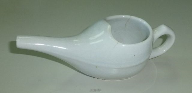 Biberon de malade en porcelaine blanche avec une rainure sur les cotés ayant un long bec muni d'une anse disposée à l'arrière par rapport au bec. Inscription : Gien France. Diamètre : 7 cm. Longueur : 18 cm.